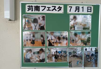 下の写真は、講堂前の掲示板です。先日行われた「苅南フェスタ」の様子がご覧になれます。お店で楽しんでいる姿や店番をがんばっている姿がとてもいきいきと感じます。