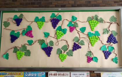 正門前には、美味しそうなブドウがたくさん実っているようすが掲示されています。日本では、9月はブドウの旬な時期で、多くの品種が最も美味しくなる時期です。