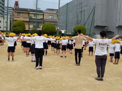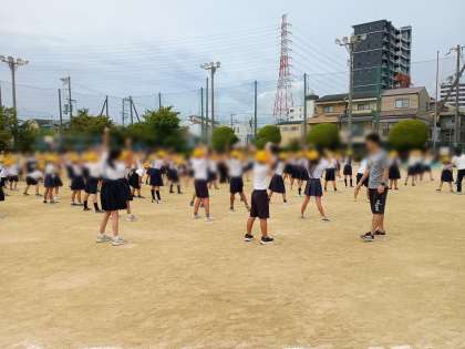 台風15号の影響で朝からすっきりしないお天気でしたが、全校児童が運動場に集まり、体操隊形の確認からラジオ体操第一で元気よく体を動かしました。