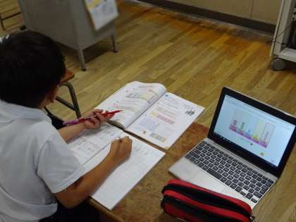 子どもたちは、タブレットの学習ソフトで、自分で問題を作って解いたりしながら理解を深めていました。