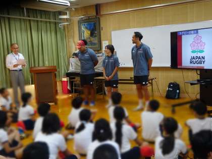 この授業は、日本ラグビーフットボール協会が、10月18日(土)に大阪で行われるラグビー代表戦(JAPAN XV 対 オーストラリアA代表)等を契機として、小学生向けのラグビーの普及活動の一環として行われました。