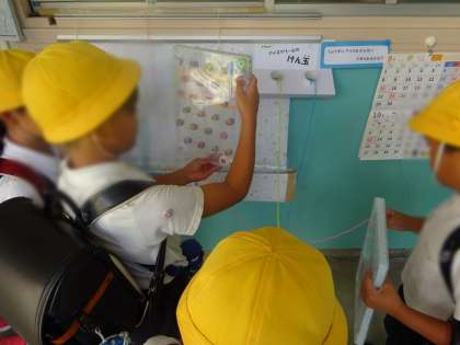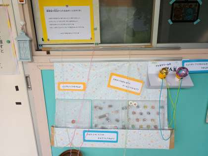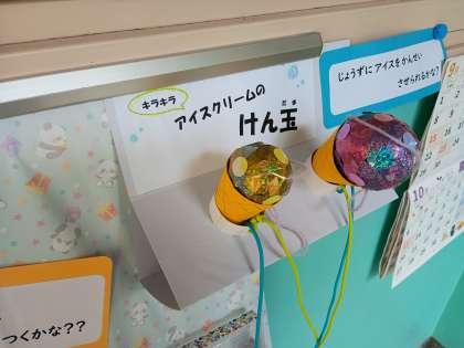 本校事務室の前を通ると、季節に合った飾りや子どもたちが手に取って楽しめるような飾り物が目に留まります。今回は、ペットボトルのふたを転がして遊ぶおもちゃ&アイスクリームの形をしたけん玉が置かれていました。もちろん、手作りです。