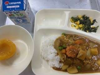 今日の献立は ・ポークカレーライス ・ほうれんそうのソテー ・黄桃(缶) ・牛乳 です。