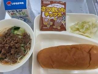 10/17 今日の給食 公開日 2025/10/17 更新日 2025/10/17 お知らせ 今日の献立は ・タンタンめん ・キャベツの甘酢づけ ・おさつチップス ・おさつパン ・牛乳 です。 いいね(0)