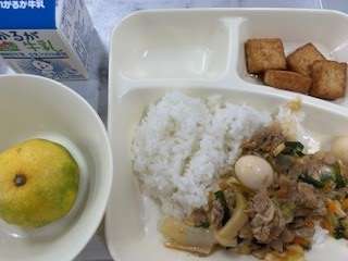 今日の献立は ・中華丼 ・あつあげの中華だれかけ ・みかん ・ごはん ・牛乳 です。