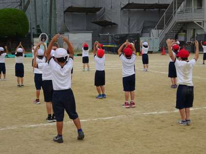 運動会までおよそ3週間となりました。練習場所も講堂から運動場に変わりました。団体演技では、一つ一つの動きを覚える練習から、立ち位置や隊形移動などを覚える練習へと移っていきます。