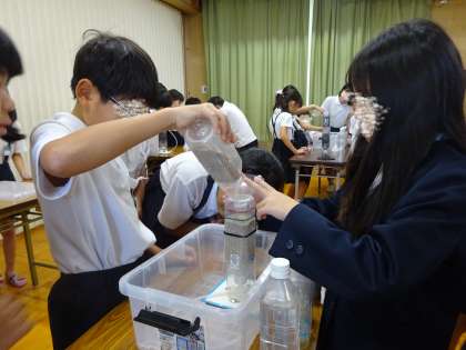 10/7 4年出前水道教室 公開日 2025/10/07 更新日 2025/10/07 お知らせ 4年生は、大阪市水道局の職員の方にお越しいただいて、出前水道教室の授業を受けました。 まずは、映像を活用して浄水場の仕組みや安全への取り組み等の説明を受けました。 そして、浄水処理工程の一部である砂ろ過と粒状活性炭ろ過について、ペットボトルなどを使ったミニチュア模型で実際に体験しました。 いいね(0)