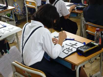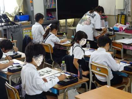 4年生は、書写の時間に、毛筆を使って、「土地」の二文字を左右の部分の組み立て方を理解し、正しく整えて書くことができるように練習しました。。