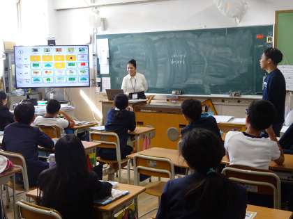 6年生は、英語の学習で、eatやliveなどの動詞を使って文を作りました。
