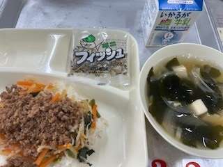 今日の献立は ・ビビンバ ・わかめスープ ・ミニフィッシュ ・牛乳 です。