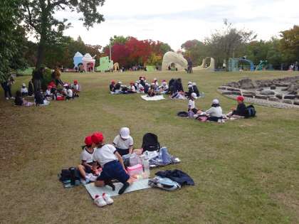 「もくもく元気広場」で思いっきり遊んだ後は、芝生広場に移動してランチタイムとなりました。みんなが楽しそうに友だちとお弁当を広げる姿が印象に残りました。