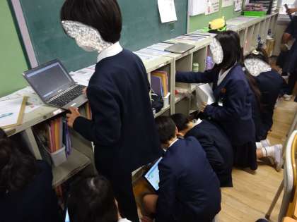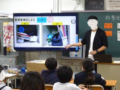 子どもたちは、ロッカーやお道具箱の中を整理・整頓しました。そして、整理・整頓する前後の写真を撮り、それらを比べることで、どのような工夫をしたのかを「発表ノート」に記入し、全体で交流しました。
