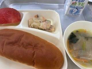 今日の献立は ・さけのマリネ ・肉だんごと押麦のスープ ・りんご ・黒糖パン ・牛乳 です。