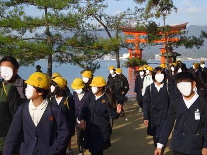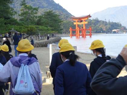 まずは、ユネスコの世界文化遺産に登録されている厳島神社を見学しました。この厳島神社は、今から1,400年以上も前、推古元年(593年)に現在の場所に創建されたと伝えられています。写真は、大鳥居を目にしながら、厳島神社に向かっている子どもたちです。