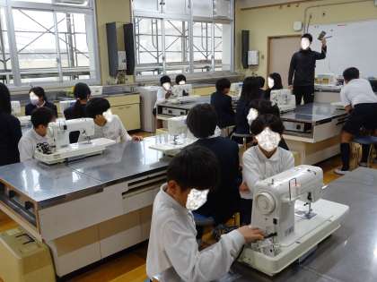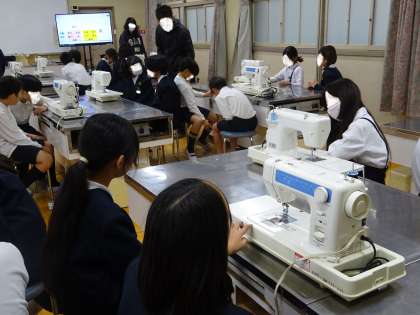 5年生の家庭科では、ミシンを使って作品を製作します。今日は、ミシンを準備し、使い方を学びました。