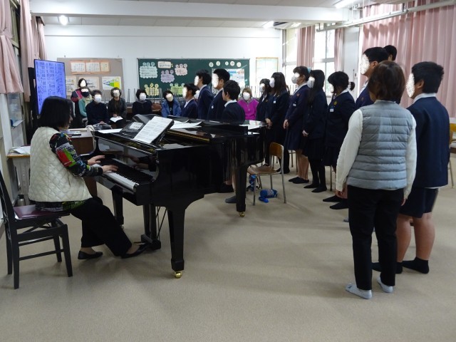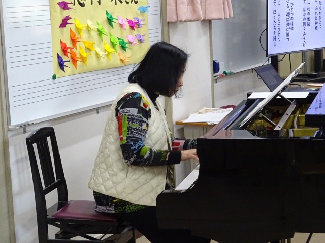 続いて、志村泉さんの伴奏で、「たび」「ます」などを歌いました。そして、ショパンの「革命のエチュード」など、志村泉さんの迫力のあるピアノ演奏を聞かせていただきました。子どもたちは、志村泉さんの演奏に、心を虜にされているようでした。最後に、「森は生きている」より、「森は生きている」「カラスの歌」「ウサギとリス」など、志村泉さんの伴奏で歌いました。
