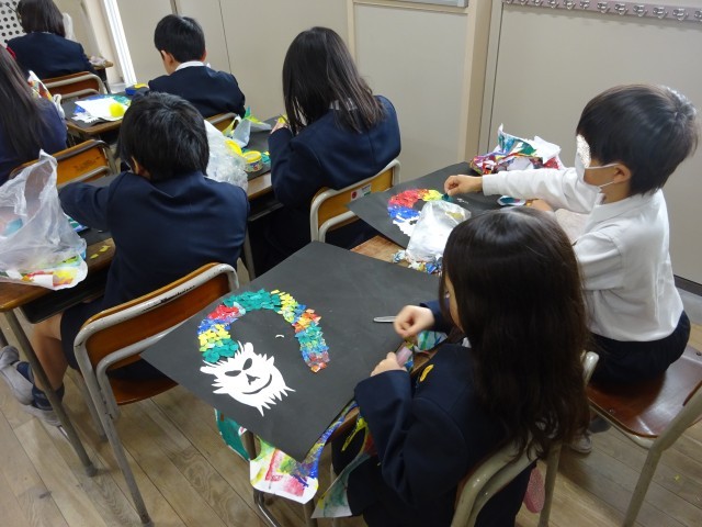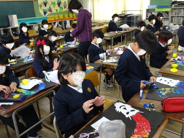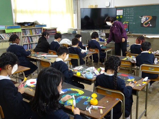 12月15日(月)、3年の図画工作科では、着色した用紙を細かく切って、竜のうろこ1枚1枚と見立てて貼っていきました。そして、神々しくも荒れ狂う竜の姿を表現しました。