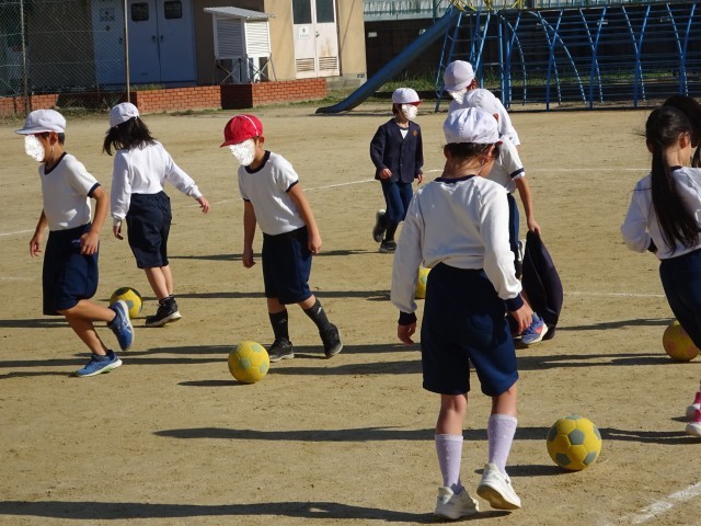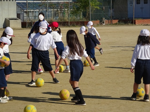 12月23日(火)、2年生は体育の学習でボールゲームをしています。今日はサッカーです。まずは、ドリブルの練習をしました。