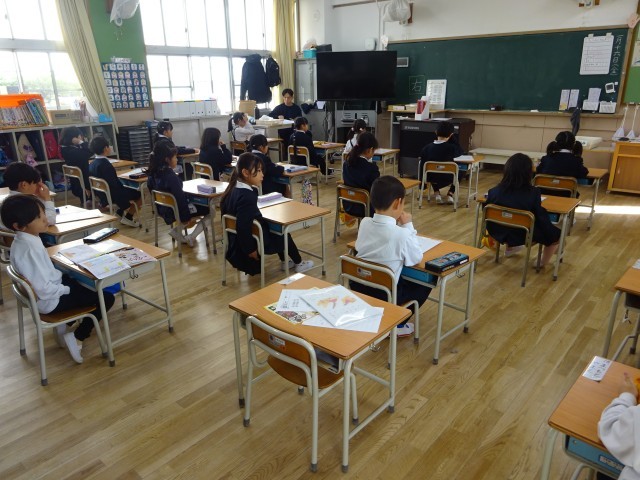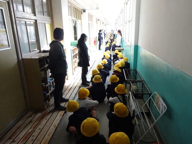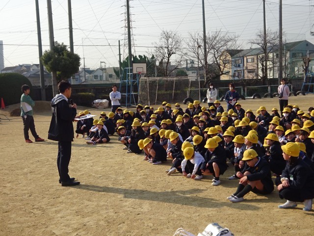 校内放送で地震が起きたことを知らせた後、子どもたちは運動場へ避難しました。全員が集まるまで3分かからなかったほど、素早く移動できました。教頭先生のお話の後、津波警報が発令されたという設定で、全員、校舎の3・4階に避難しました。全員の無事を確認した後、教室に戻り、校長先生から阪神・淡路大震災や防災に対する備えについて等のお話があり、訓練は終わりました。