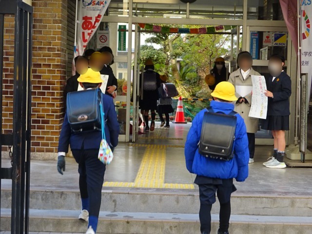今週は「あいさつ週間」です。給食委員会の子どもたちが登校時に玄関前であいさつをしています。