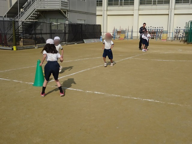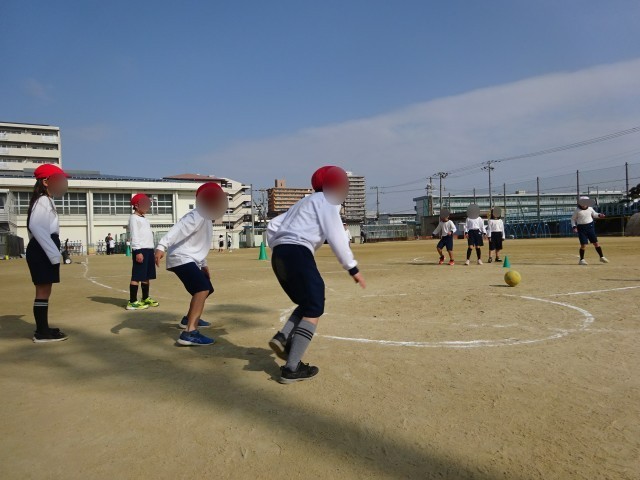 2年生の体育は「ベースボール型ゲーム」です。とは言っても、ボールを手やバットで打つのではなく、足で蹴る「キックベースボール(以下 キックベース)」です。