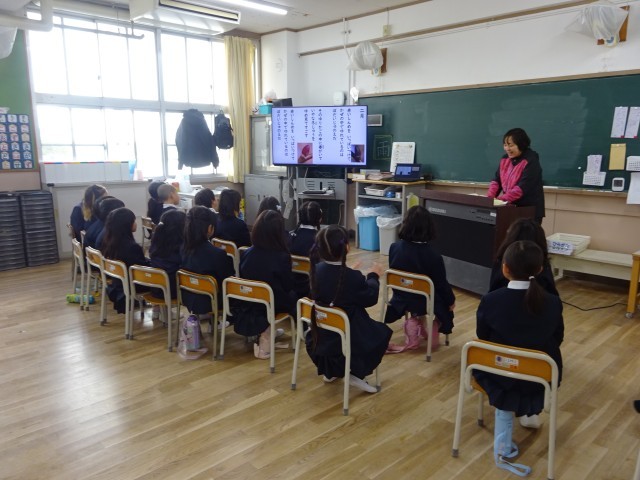 1年生は時々、担任が入れ替わって授業をする「交換授業」を取り入れており、写真は2組の音楽の授業です。曲は、まど・みちおさんによる詩「二月」を子ども向けの歌としたものです。