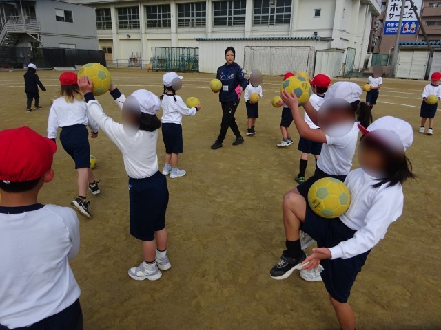 午前10時過ぎの気温は5度という寒波の中で、1年生は元気に体育の学習「サッカー遊び」です。