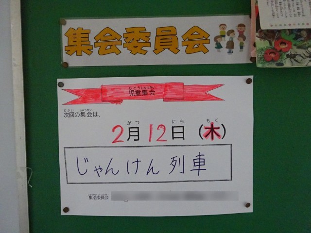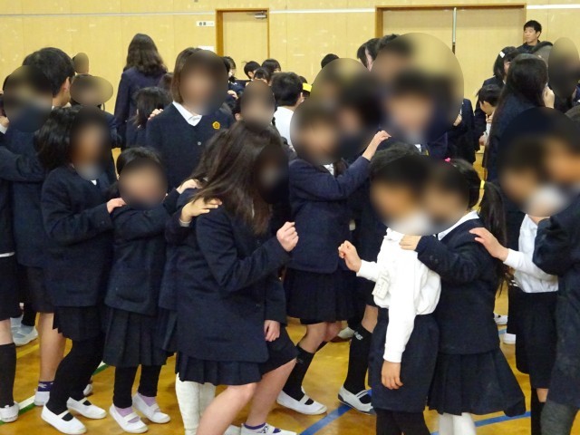 今日の児童集会は「じゃんけん列車」でした。最初に同じなかよし班のペア学年の二人組からじゃんけんをスタートし、その後は音楽に合わせて講堂内を移動、音楽が止まったら近くのグループとじゃんけんというその繰り返しでした。