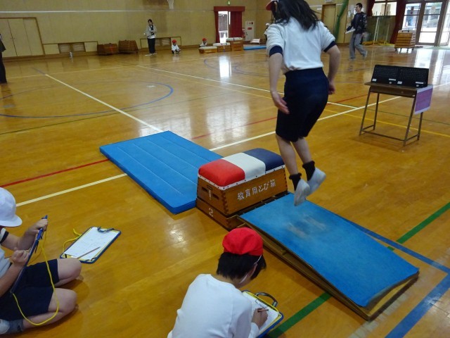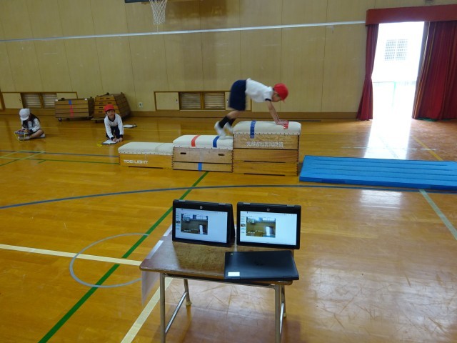 今回の授業は、跳び箱を跳ぶための準備段階、つまり、跳ぶために必要な動きを意識し、練習していました。跳び箱や平均台などを使った6つのブースがあり、それぞれのブースにはタブレットが設置され、「おいかけ再生」で自分の動きを振り返られるようになっていました。