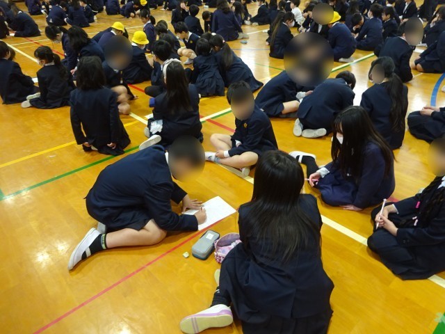 今回のゲームは「イントロクイズ」です。児童集会では定番のネタですが、問題に使われる曲がそのときの旬なものが多いので、曲を聴くたびに「今年はこんな曲がはやっているんだ…」「何となく聞いたことはあるが題名と歌手名が出てこない」と感じます。今回でいえば、「IRIS OUT」(米津玄師)や「ごはん食べヨ」(Mega Shinnosuke)などがそれに当たりました。一方、子どもたちはこれらの曲をよく知っており、さらっと解答用紙に答えを書くところがさすがでした!