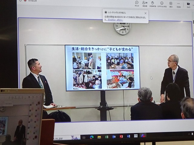 主な内容として、本校の子どもたちの自己肯定感と自己有用感を高めるために、4年間取り組んできた生活・総合(的な学習)の研究を通しての実践例やそれによる子どもたちの変容、今後の向けての課題等を発表しました。途中、会場と本校多目的室を中継で結び、本校から教員が発表する予定でしたが、突然のアクシデントで一時取り止めとなりました。しかし、場所を校長室に変えて、再チャレンジしたところ、無事に中継がつながり、発表と併せて、教職員のアットホームな雰囲気を会場に伝えることができました(笑)。