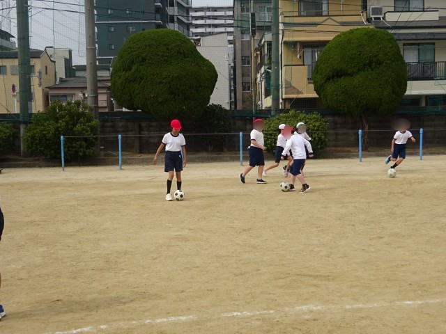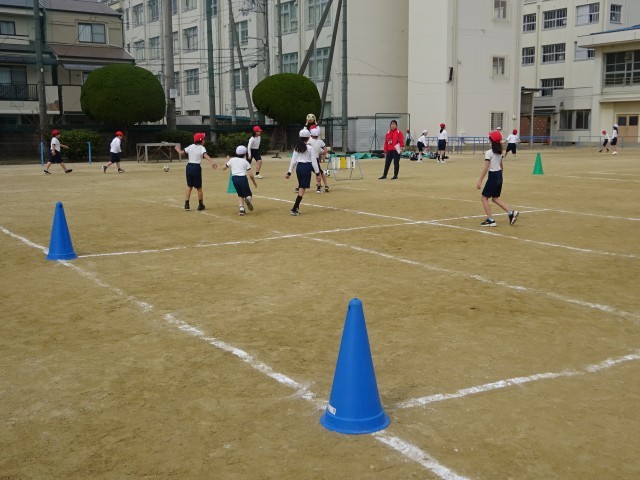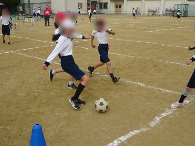 4年生は運動場で体育の学習です。サッカー型のゲームをしていました。