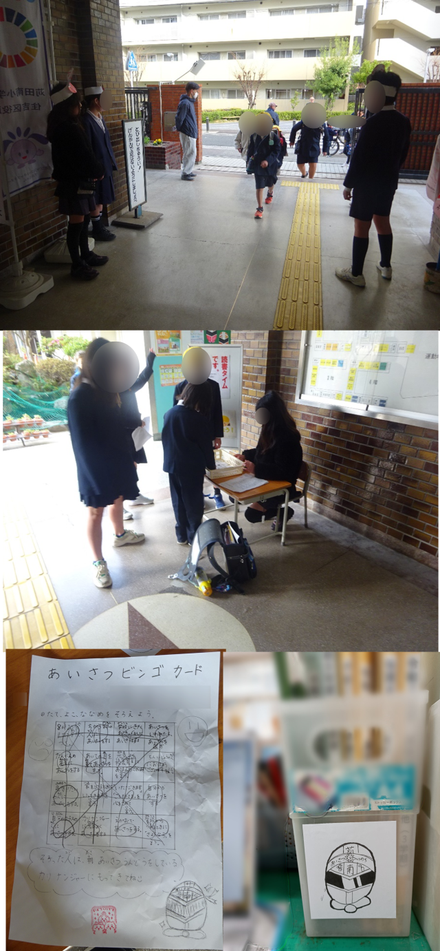 今回は「あいさつ戦隊カリナンジャー」のお面をかぶってあいさつをするだけでなく、「あいさつビンゴ」というものが登場し、ビンゴが揃うとシールがもらえるという企画も行われていました。