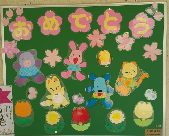 上の写真は玄関前、下の写真は講堂前に飾られている掲示物です。子どもたちが描いた花がいっぱい詰められた花束やかわいい動物たちが6年生の卒業をお祝いしています。