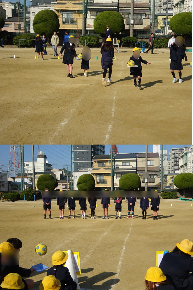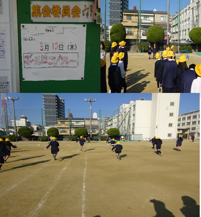 今年度最後の児童集会は、運動場で「ボール運びリレー」でした。