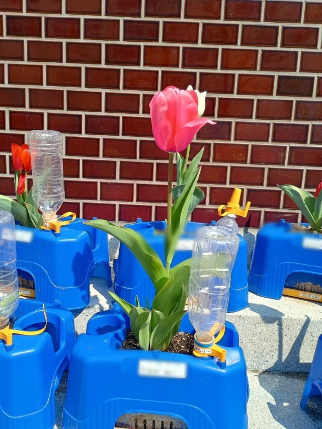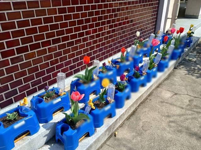 赤、白、黄、桃に紫といろいろな種類のチューリップが職員室の前に並んでおり、色鮮やかでとてもきれいです。ただ、チューリップの花の寿命は1~2週間程度であり、20度超えるような暖かい日が続くと、数日で終わってしまうこともあるそうです。