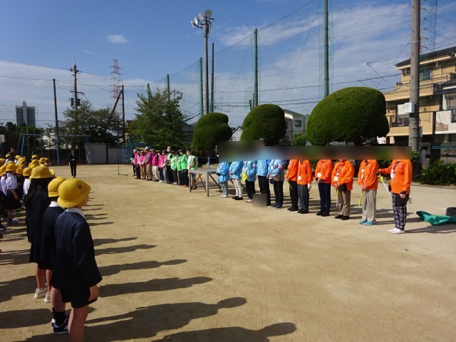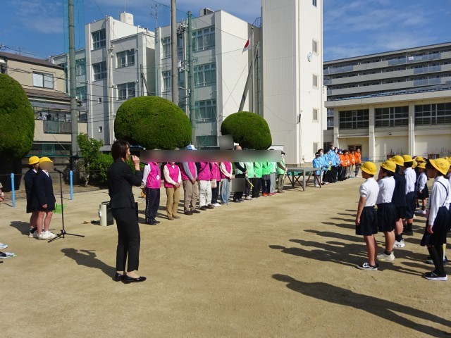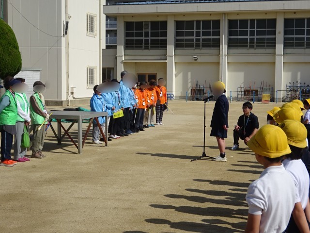 朝から心地よい春の陽気の中、全校児童が集まる運動場に、桃、黄緑、水色、橙のジャケットを着た23名の見守り隊の方々が来校されました。