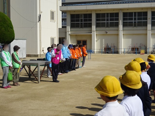 校長先生と児童代表のお礼の言葉の後、地域活動協議会(地活協)の会長様からご挨拶をいただきました。お話の中で子どもたちに「あいさつをしよう」「黄帽をかぶろう」と登下校時における2つの約束を確認されました。特に黄帽に関しては、ドライバー(車の運転者)にとって子どもたちの存在を確認する目印となり、子どもたち自身も身の安全を守ることになり、とても大切なことです。