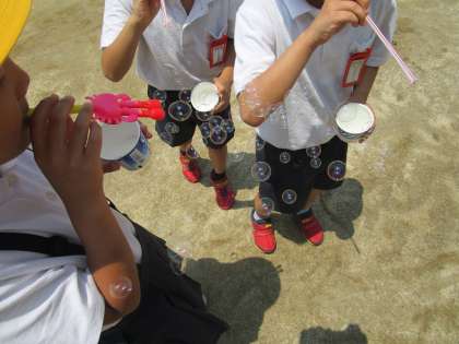 1年生の生活科の学習で「しゃぼんだま」をとばしました。