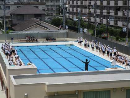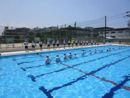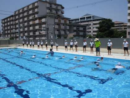 服を着た状態で水に入ったらどうなるのかを体験するため水着に体操服を着てプール水泳学習を行いました。