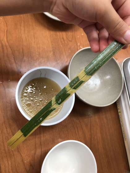 お昼に自分で作った竹箸を使って食べています。