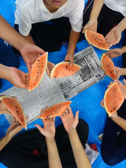 飯ごうが片付いた班から、すいかをいただきます。お疲れ様