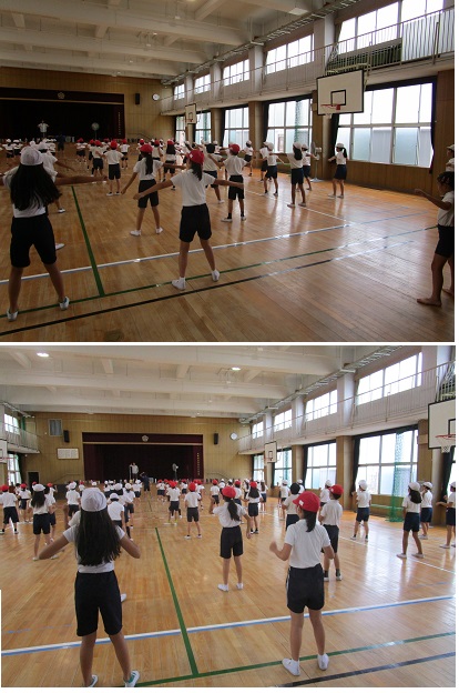 音楽やカウントにあわせてリズムよく体を動かしています。