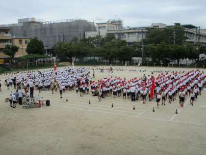 今日は児童席の確認、入場行進、開会式の練習、ラジオ体操の練習をしました。