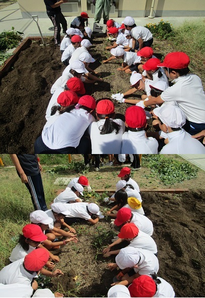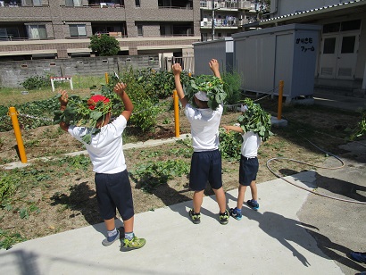 管理作業員さんにつるを切ってもらい、株のところをまわりから掘ると大きなサツマイモが採れました。