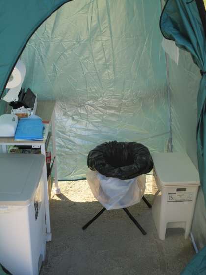 写真中 開設訓練での簡易トイレです。手すり有りもあります。またテントも設置しました。