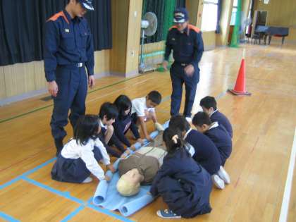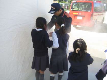 防災についてのDVDを見た後、毛布を使ってケガをした人を運ぶ練習をしたり、煙ハウスの中に入って煙の体験をしたりしました。