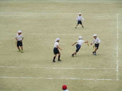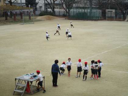 2年生が体育科の学習で「しっぽとり」をしました。青や赤、黄などのしっぽを取り合いました。