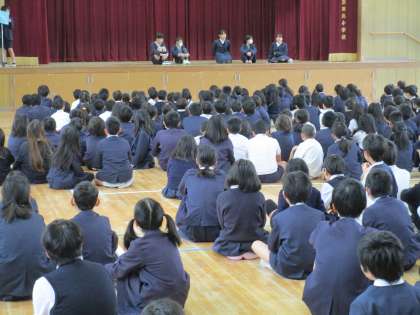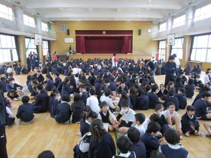 今日の児童集会は、古今東西ゲームでした。はじめに集会委員会の人がお手本を見せてくれました。その後は、縦割り班でゲームを楽しみました。