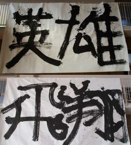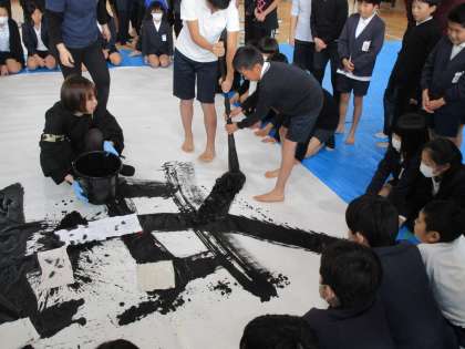 地域の方にご協力いただいて、6年生が卒業記念の書道を行いました。講堂の床に大きな用紙を敷き、大筆で力強く一画一画を真剣に書いていきました。今年の文字は「英雄」と「飛翔」です。講堂に展示していますので、ぜひご覧ください。